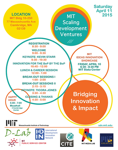 In April 2015, Scale-Ups, organized the third annual MIT Scaling Development Ventures, a daylong conference with well over 275 attendees from around the world. Conference collaborators this year included MIT D-Lab, the MIT Public Service Center, the MIT Media Lab, the International Development Innovation Network, and the Comprehensive Initiative on Technology Evaluation.